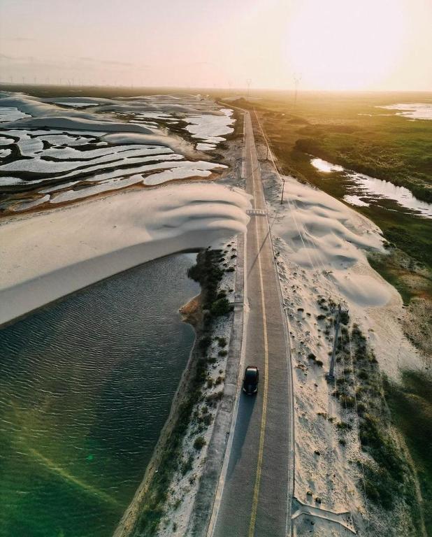Outro ponto que impressiona é o moderno Parque Eólico, onde enormes torres se erguem entre a vegetação e as dunas, criando um contraste fascinante entre natureza e tecnologia. A poucos minutos dali, o Morro da Mendanha oferece uma vista panorâmica da cidade e do entorno, sendo um convite para quem gosta de explorar e admirar a beleza do alto. A subida é leve e recompensadora, principalmente ao entardecer.